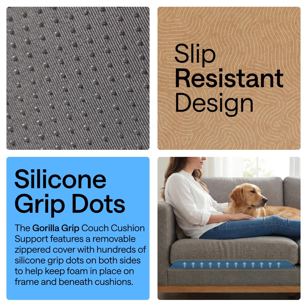- STRONG HOLD GRIP DOTS: hundreds of silicone grip dots on top and bottom help keep sofa support foam in place on couch frame and under cushions; helps cushions remain steady and aligned, reducing sliding, bunching and constant readjusting; underside dots hold foam to the sofa base