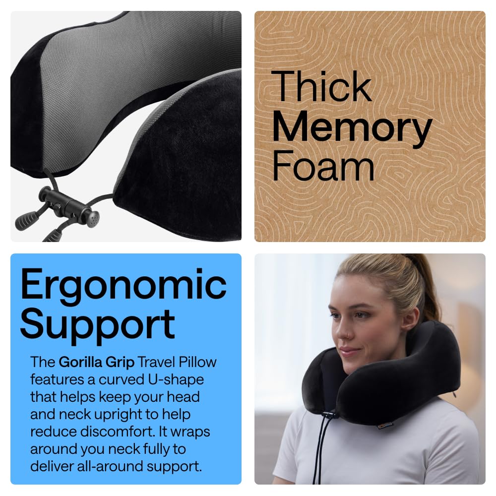 GORILLA GRIP Travel Neck Pillow for Airplanes, CertiPUR-US® Memory Foam Cooling Mesh Pillows, Soft Velvet Washable Cover, Support Headrest for Sleeping, Traveling Essentials Flight Accessories, Black—